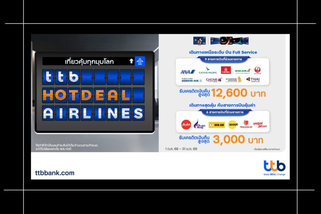 บัตรเครดิต ttb ชวนเที่ยวคุ้มทุกมุมโลก มอบเครดิตเงินคืนสูงสุด 15,600 บาท กับ 15 สายการบินชั้นนำที่ร่วมรายการ