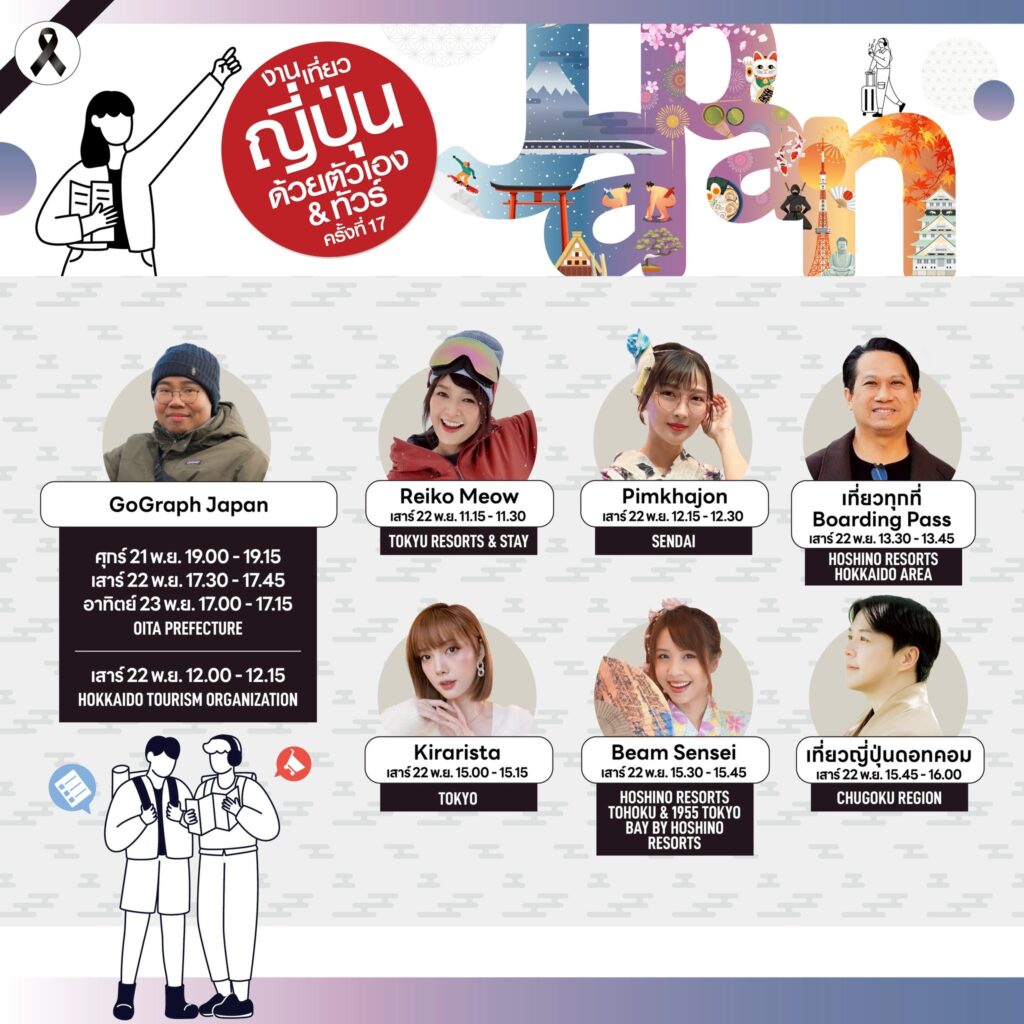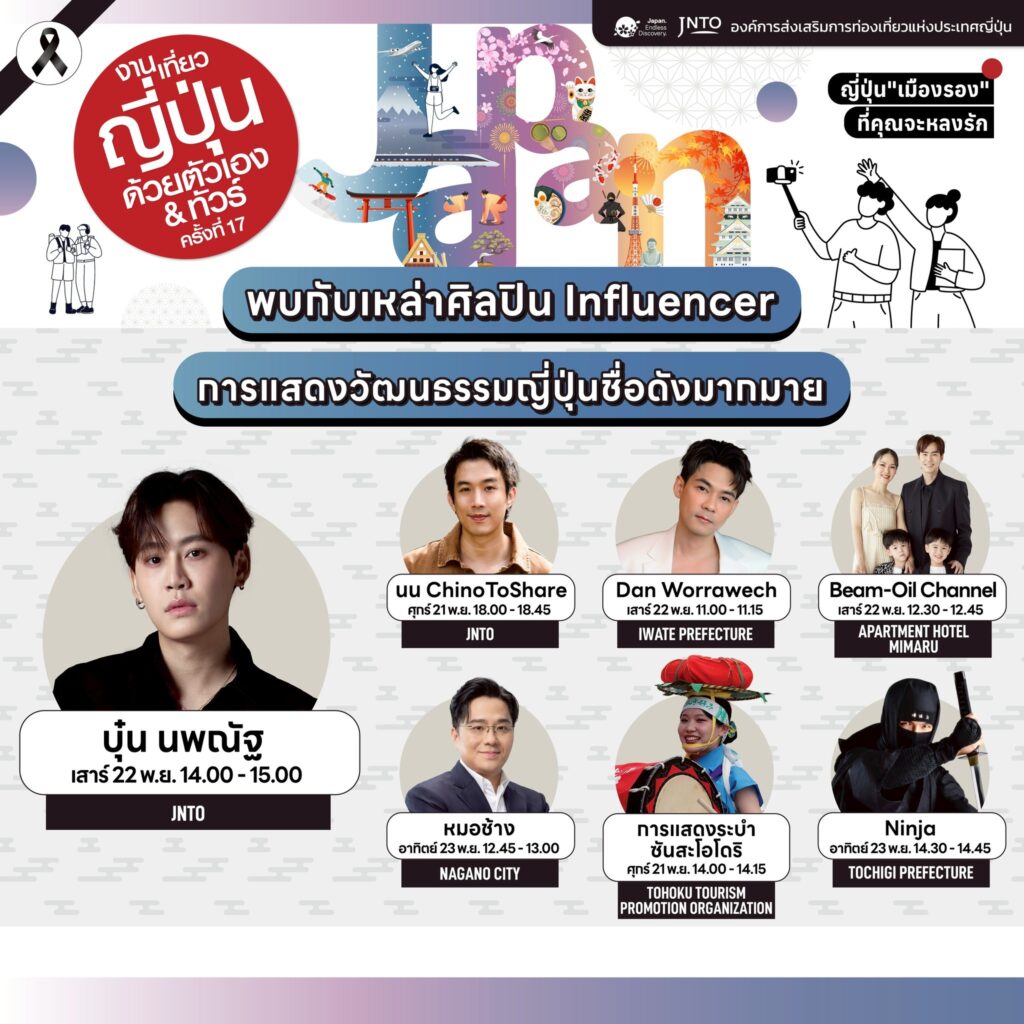 วันอาทิตย์ที่ 23 พฤศจิกายน 2568 วันสุดท้ายของการจัดงาน พบกับเหล่า YouTuber และ Blogger สายเจแปนที่จะมาเล่าประสบการณ์เที่ยวญี่ปุ่นแบบ Unseen ที่จะทำให้คุณอยากแพ็กกระเป๋าทันที อาทิ แอดอ้น แอดมินเพจ Go!Graph Japan, นัท Eat Chill Wander, ฮารุปี้ Harupiii, เคนจิ หรือมะม่วง ญี่ปุ่นมั้ย? by Kenji และแขกรับเชิญพิเศษ หมอช้าง ทศพร ศรีตุลา พร้อมรับชมโชว์ “นินจา” สุดว้าวที่ส่งตรงจากประเทศญี่ปุ่น