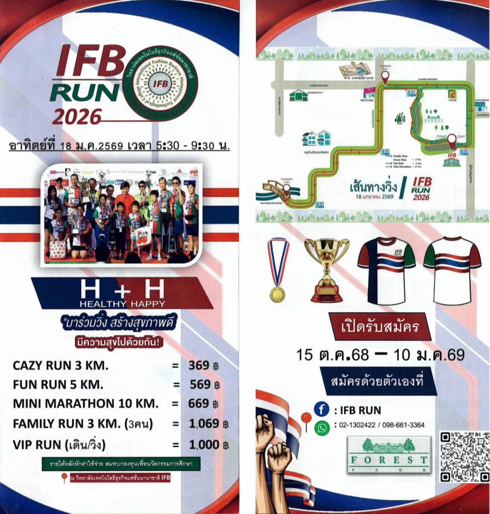 วิทยาลัยเทคโนโลยีธุรกิจแฟชั่นนานาชาติ (IFB) ร่วมกับมูลนิธิ ดร.เทียม โชควัฒนา ขอเชิญคนรักสุขภาพเข้าร่วมงานวิ่งเพื่อสุขภาพครั้งยิ่งใหญ่ “IFB Run 2026” ซึ่งปีนี้จัดขึ้นเป็นครั้งที่ 6