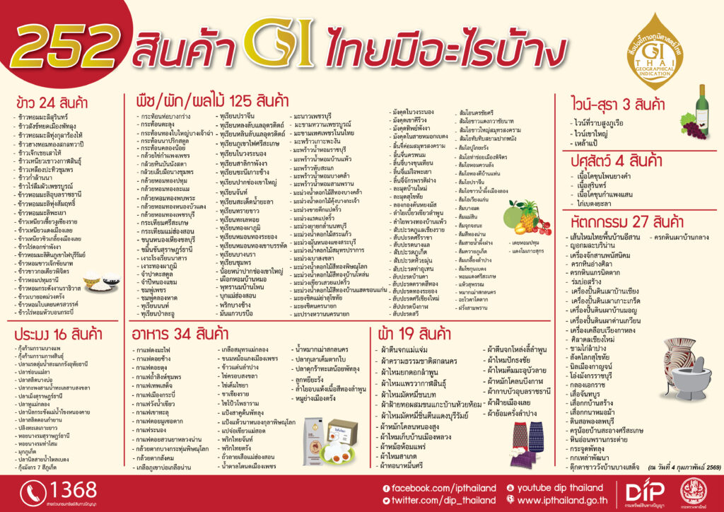 ข้อมูลอัปเดต ณ วันที่ 4 กุมภาพันธ์ 2569 จากกรมทรัพย์สินทางปัญญา กระทรวงพาณิชย์ ระบุว่าประเทศไทยมีสินค้า GI 77 จังหวัด ที่ขึ้นทะเบียนแล้วจำนวนทั้งหมด 252 รายการ